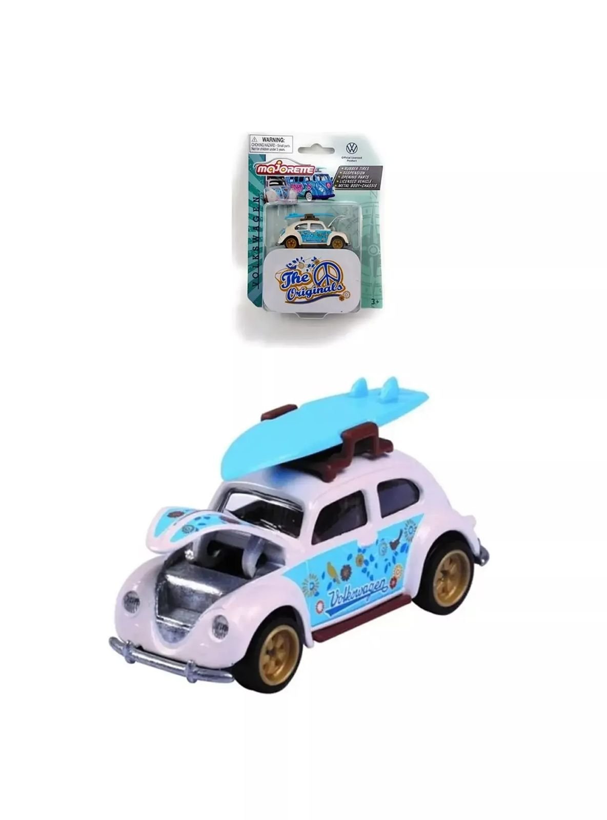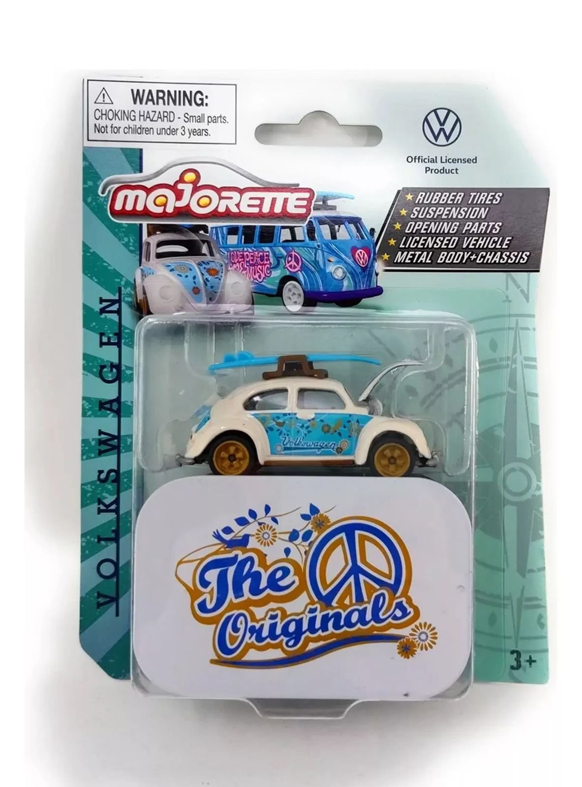 Auto de colección Majorette Volkswagen The Originals, modelo con diseño retro estilo hippie, carrocería y chasis metálicos, neumáticos de goma y piezas móviles. Edición con licencia oficial VW, ideal para coleccionistas y amantes de los clásicos.